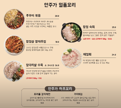 그리고 안주도 한식메뉴였는데, 고르기 힘든 것들이 많았다 (맛있어 보여서). 집에서 좀 해 먹기 귀찮은 메뉴, 그리고 막걸리와 아주 잘 어울리는 메뉴들이 엄청 그득해서 메뉴를 고르는데 한참을 고민을 하다가 주문했다.