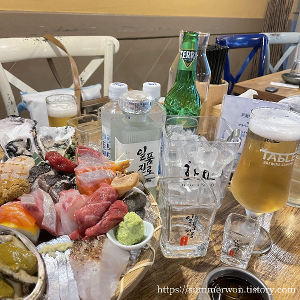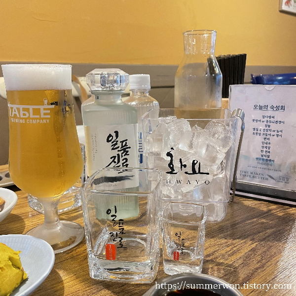 지인과 너무 신나서, 술을 안 시킬 수 없었다는! 그리고 심지어 횟집에서는 안 파는 수제맥주를 팔고 있어서 그냥 못 지나갔다. 결국 주문. 맥주 한잔 시원하게 ~ 시작하고 , 일품진로를 주문