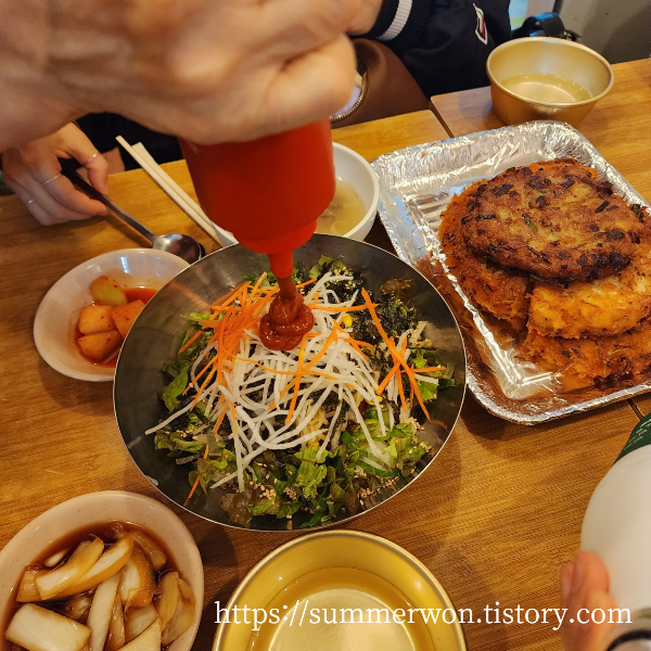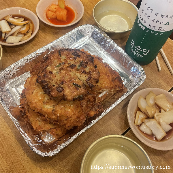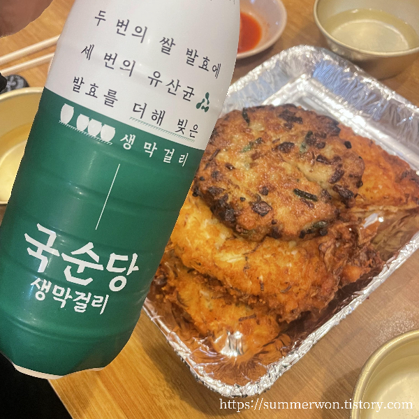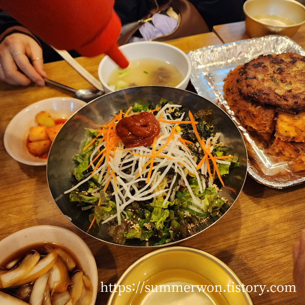 이번에 가서는 육회비빔밥과 막걸리 그리고 모둠전을 주문했다. 행복..!