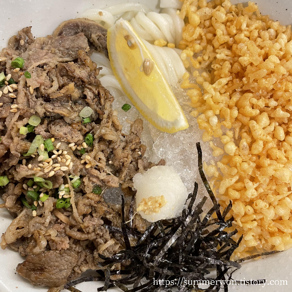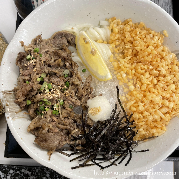 그날 날씨가 더워서, 처음 먹어보는 소고기붓카케 우동과, 사천교자를 주문했다.