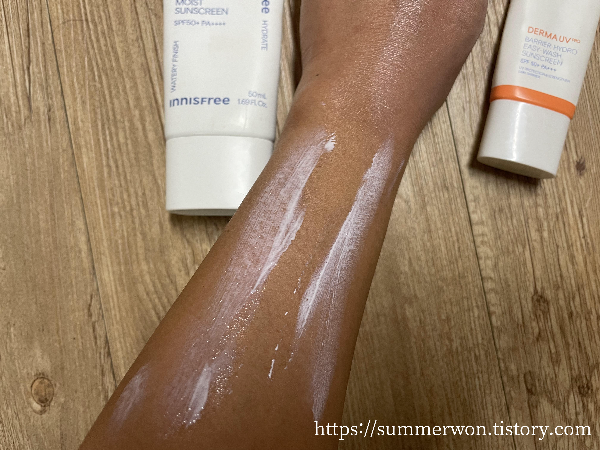 위에 사진에 비교한, 에스트라 선크림은 일단 백탁이 있는 선크림이라 흡수시킬려면 엄청나게 두둥겨야되는데, 이니스프리 히알루론 수분 선크림은 흡수가 정말 잘된다.