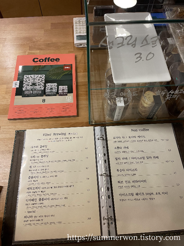 마감시간 되기전에 방문한 곳인데, 내부 인테리어가 진짜 소박하면서 아늑하고 좋았다. 그리고 커피 핸드드립을 직관적으로 볼 수 있는 인테리어가 좋았다. 매장 입구 오른쪽에는 바로 로스팅 기계가 있었다.