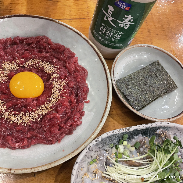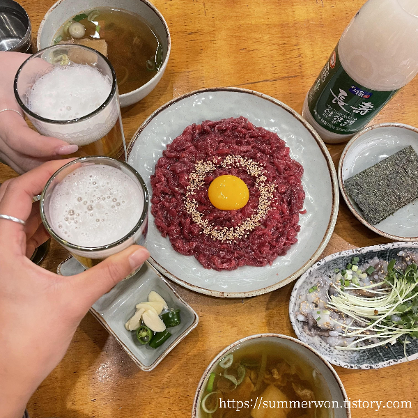하지만 서울에서 직장생활을 엄청 오래했다는 지인께서 여기가 제일이라며 강추하셔서, 그래 이번엔 육회자매집으로 가보자, 마음먹고 갔는데 역시나 오늘도 사람이 많아서 골목 안쪽에 있는 2호점으로 방문. 여기도 역시나 사람이 많았지만, 다행히 우리가 앉을자리는 있었다. 기대를 안고 주문 주문, 퇴근 후라 아주 기대되는 마음으로 방문