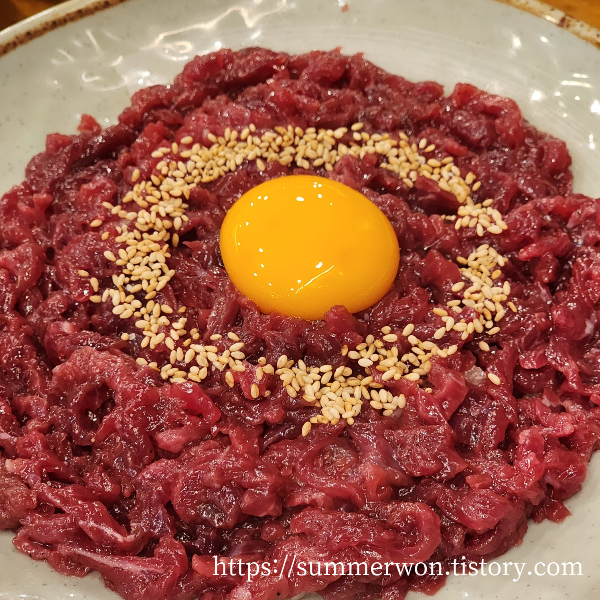 육회는 사실 고기집에서도 먹어보긴 했는데, 여기랑 은 또 느낌이 다르다. 다른 버전의 육회이다. 다른 곳에선 거의 소스맛이 강하고 좀 달달하고 뭐랄까... 좀 먹다 보면 느끼함이 올라왔는데, 여기는 진짜 깔끔했고, 육질이 살아있었다. 깔끔함 그 자체 그래서 고기의 맛이 더 잘 느껴졌다.