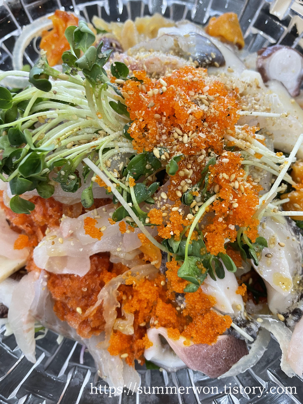 소문난 물회라고도 기재 해놓으셨고, 물회에 자부심을 느끼시는 사장님이 만드시는데 속초 청초수물회 타입이라고 해야 될까? 국물이 일단 다 얼려서 나오고 해산물이 진짜 듬뿍 들어가 있어서, 일단 양에 놀랐다.