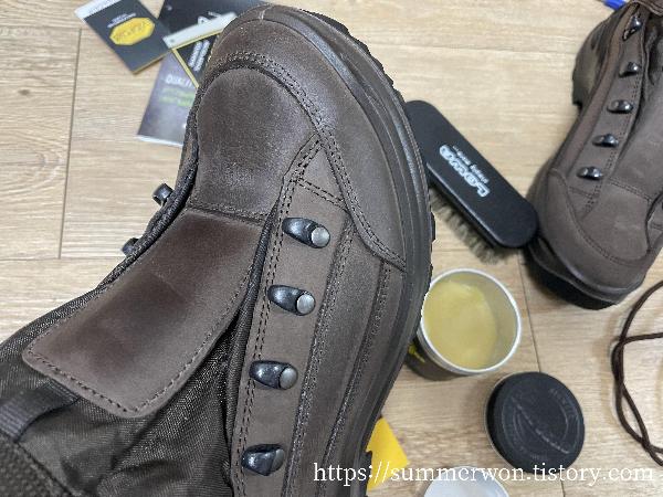 이 신발도 결국은 가죽이라서 이렇게 촉촉하고 기름진 고어왁스를 먹여줘야지만 코팅도 되고 영양공급이 된단다. 이제야 알게 된 사실... 그리고 설명서를 보니, 등산 후에는 밑창을 빼서 통풍이 잘 되는 곳에서 신발을 말려라라고 돼있다. 명심해야지!