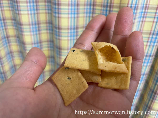 | 과자대신 먹기 좋다, 자극적이지 않고 담백한 맛 | 많이 먹으면 목매임 (튀기지 않아서 그런 듯) |
